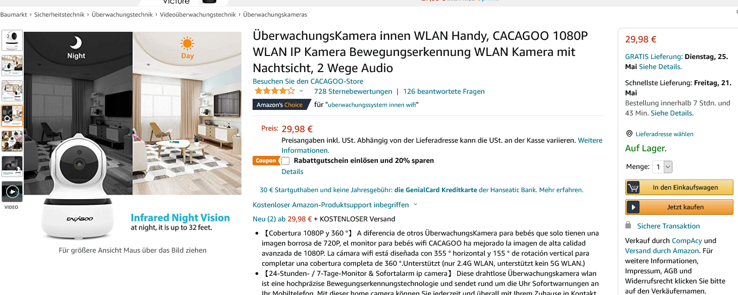 Bei Amazon gibt es eine Überwachungs-Kamera 1080P für 19,99€