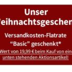 Die kostenlose Versandkosten-Flatrate wird nicht in Ihrem Warenkorb oder auf Ihrer Rechnung angezeigt. Wenn am Warenkorb der Gutscheincode BASICXMAS19 angezeigt wird und Ihre Bestellung versandkostenfrei ist, dann nehmen Sie an der Aktion teil. Die Versandkosten-Flatrate wird voraussichtlich am 18.12.2019 in Ihrem Kundenkonto hinterlegt. Sollten Sie kein Kundenkonto haben können Sie einfach vor Ihrer Bestellung ein Kundenkonto anlegen. Ohne Kundenkonto können wir Ihnen die Versandkosten-Flatrate nicht hinterlegen. KEIN Abo – Flatrate endet nach einem Jahr automatisch!