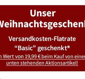 *Die kostenlose Versandkosten-Flatrate Basic gilt nur bei Kauf eines Aktionsproduktes und nur bis 13.12.2019. Zudem muss der Gutscheincode BASICXMAS19 am Warenkorb eingegeben werden. Damit die Versandkosten-Flatrate Basic hinterlegt werden kann, müssen Sie ein Kundenkonto besitzen, oder ein Kundenkonto anlegen. Die Versandkosten-Flatrate Basic wird erst ab dem 18.12.2019 aktiviert. Sollten Sie durch eine Retoure den Mindestbestellwert nicht mehr erreichen, dann wird auch Ihre kostenlose Versandkosten-Flatrate Basic wieder storniert und aus Ihrem Kundenkonto entfernt. Wichtiger Hinweis: Marktplatz Bestellungen sind von dieser Aktion ausgeschlossen!