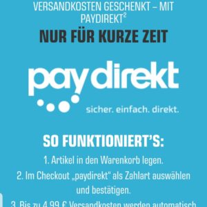 Einfach dafür den Gutschein-Code „paydirekt“ eingeben und als Zahlart Paydirekt auswählen.