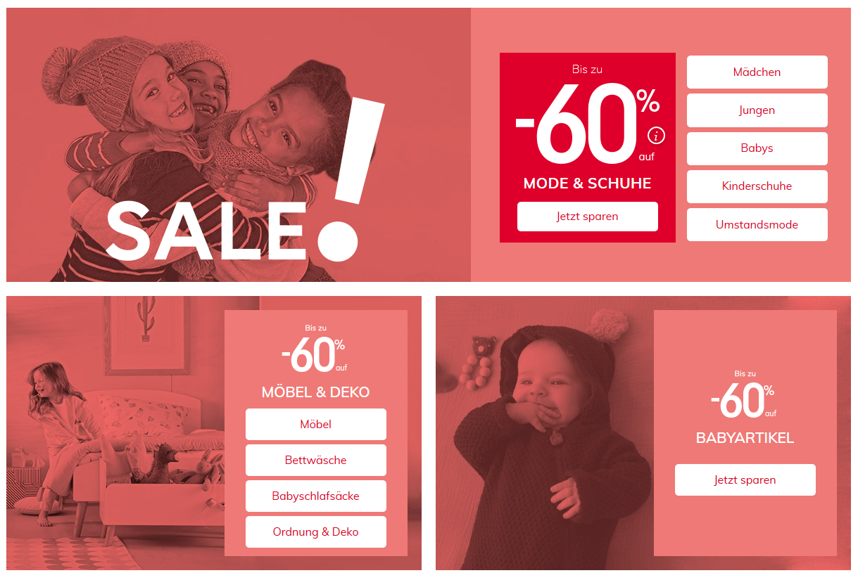 Aktuell gibt es bei vertbaudet einen Sale mit bis zu 60% Preisnachlass auf folgende Kategorien: