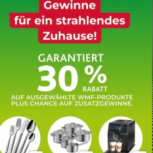 Glänzende Idee: Einfach Vileda Produkte Deiner Wahl kaufen, Kassenbon hochladen und 30 % Rabatt auf ausgewählte WMF-Artikel erhalten! Mit etwas Glück gewinnst Du außerdem einen der 70 attraktiven Hauptgewinne.