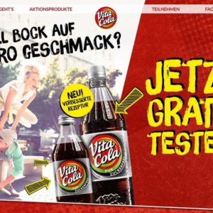Die Teilnahme an der Aktion ist ausschließlich online über die Aktionswebsite http://www.vitacola-gratis.de im Aktionszeitraum vom 03.08.2020 bis zum 01.11.2020 und nur nach Kauf einer 1,0-L-PET-Mehrweg- oder einer 0,33-L-Glas-Mehrweg-Aktionsflasche VITA COLA Pur zuckerfrei möglich. Andere Produkte des Veranstalters nehmen nicht an der Aktion teil.