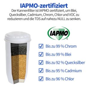 - Zertifiziert nach IAPMO & NSF Standards — Geprüft nach NSF/ANSI 42 und 53, garantiert sichere Materialien, stabile Struktur und nachgewiesene Filterleistung.