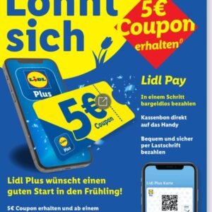 Für alle LidlPlus-App-User und Lidl-Großeinkäufer gibt es vom 24.-29.3.25 in der LidlPlus-App einen 5€-Coupon. Dieser ist einmalig in der Filiale ab einem Mindesteinkaufswert von 50€ einlösbar. Er ist allerdings nicht mit anderen €-Coupons wie zB dem 4€-Rabattsammler-Coupon kombinierbar und vom MEW sind Zeitschriften, Rettertüten, Bücher, Tabakwaren, Pfand, Telefon- und Gutscheinkarten sowie CO2-Zylinder wie üblich ausgenommen.