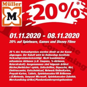 Bei Müller bekommt ihr vom 01.11.2020 – 08.11.2020, 20% auf Spielwaren, Games und Disney Filme