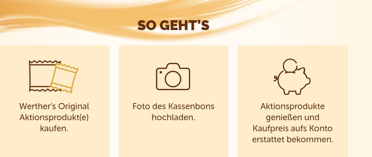 Für die Teilnahme an der Promotion „Gratis Probieren“ benötigt der Teilnehmer den Kassenbon der gekauften Werther’s Original Aktionspackung. Eingeschlossen in die Aktion „Gratis Probieren“ sind die Werther’s Original Bonbonsorten in folgenden Verpackungsgrößen: Sahnebonbons 245 g, Caramel & Crème 225 g, Schoko Toffees 180 g, Soft Caramel 180 g, Soft Eclair 180 g.