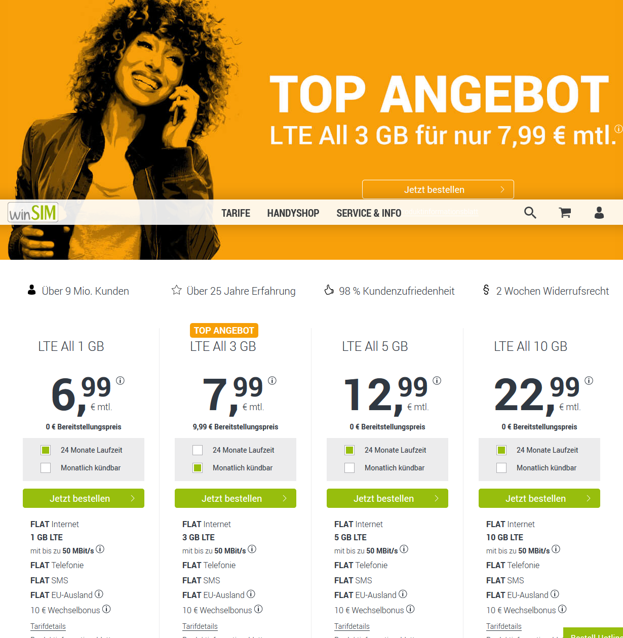 - Smartphone-Tarif winSIM LTE All 3 GB für nur 7,99 EUR pro Monat im Netzverbund der Telefónica