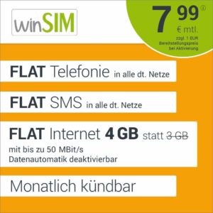 Amazon Aktion: winSIM LTE All 4 GB statt 3GB Allnet Flat – monatlich kündbar (Flat Internet 4 GB LTE mit max. 50 MBit/s mit deaktivierbarer Datenautomatik, Flat Telefonie, Flat SMS & Flat EU-Ausland, 7,99 Euro/Monat)