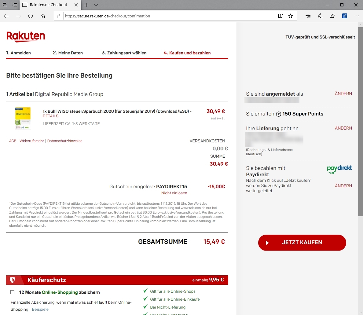 Bei Rakuten könnt ihr derzeit die mehrfach ausgezeichnete Buhl WISO steuer: Sparbuch 2020 (für Steuerjahr 2019) (als Download-Version) für 15,49€ durch den 15€-Paydirekt-Gutschein als Download erwerben.