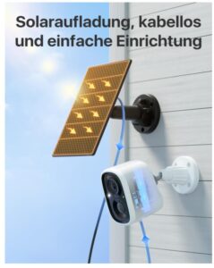 - IP65 wetterfest & einfache Einrichtung: Entwickelt, um rauem Wetter zu trotzen; einfach mit Schrauben an der Wand zu befestigen; das Kabel des Solarpanels lässt sich bis zu 2,8 m (9,2 ft) verlängern; die Kamera und die Halterung des Solarpanels können um 360° gedreht werden, was eine flexible Platzierung in jeder Ecke im Freien ermöglicht