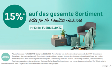 Gültig bis 31.05.2019. Anrechenbar auf das Sortiment von yomonda.de. 5000 € maximaler Bestellwert. Kann mit weiteren % Gutscheincodes kombiniert werden. Nur mit Kundenkonto einmalig einlösbar. Nur online einsetzbar, keine Barauszahlung oder nachträgliche Anrechnung. Nicht auf Bücher, Geschenkgutscheine, Geschenkservice, Nachnahmegebühren, Versandkosten, Elektroartikel und das Kindersortiment von yomonda.de anrechenbar. Der Rabatt wird in Ihrem Warenkorb nach Eingabe des Gutscheincodes automatisch abgezogen.
