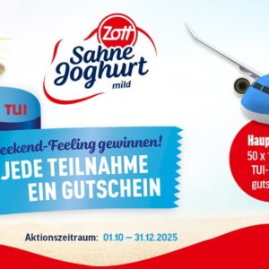 Beim Kauf mindestens eines Zott Sahne Joghurts bekommt ihr einen Gutschein von TUI. Dieses kann entweder ein Sofortgewinn oder ein Hauptgewinn sein.