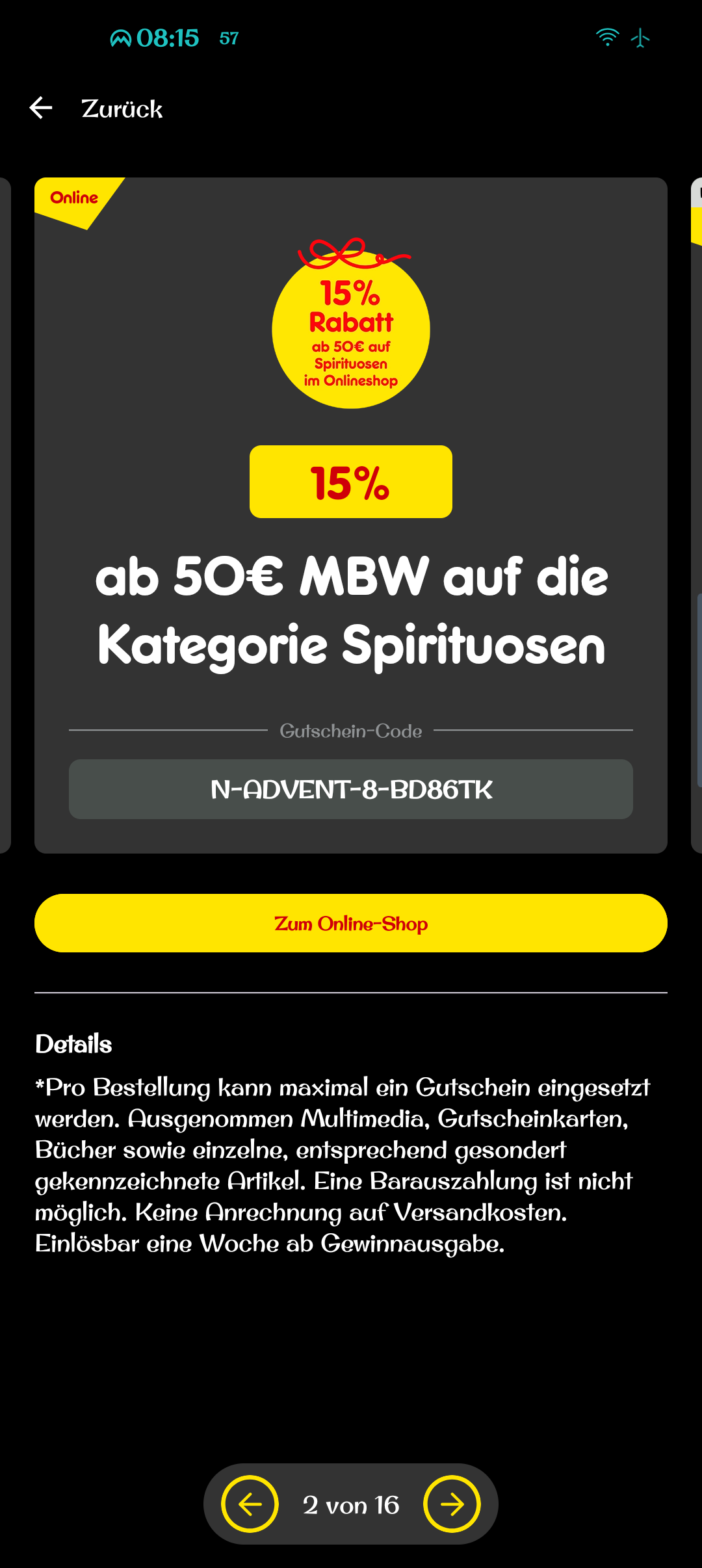 Nimueh 06.12.2025, 08:17Heute "15% ab €50 MBW auf die Kategorie Sprituosen" im Online Shop. Brauche ich im Leben nicht – aber vielleicht freut sich hier jemand drüber?
