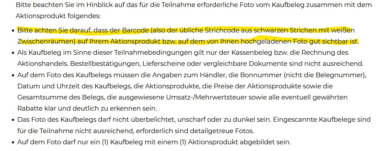 Zusätzlich kann den Teilnahmebedingungen der EAN- Strichcode der zulässigen Aktionsprodukte entnommen werden.